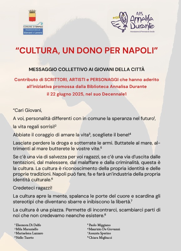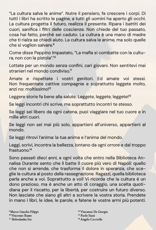 Sono passati dieci anni, e ogni volta che entri nella Biblioteca Annalisa Durante sento che il cuore batte più vero di Napoli: quello che non si arrende, quello che trasforma il dolore in speranza, quello che scende in campo per la libertà, per costruire un futuro diverso. Ragazzi, quella biblioteca parla anche a voi. Sopraffatto a voi. Vi ricorda che la cultura è un dono prezioso, ma è anche un atto di coraggio, una scelta quotidiana per il rischio, per la libertà, per costruire un futuro diverso. Non lasciate che siano gli altri a scrivere la vostra storia. Prendete in mano i libri, le idee, le parole, e fate che le vostre armi più potenti. Ribellatevi all'ignoranza che ruba sogni, al silenzio che ruba voce, alla differenza che ruba coscienza. Perché chi legge, vince. Sempre. Per sé, per gli altri, per Napoli.