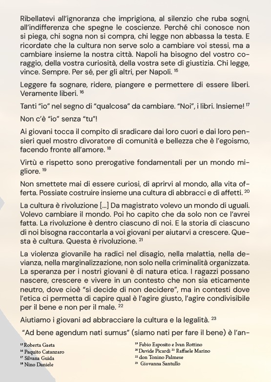 Leggere fa sognare, ridere, piangere e permettere di essere liberi. Veramente liberi. Tanti "io" nel segno di "qualcosa" da cambiare. "Noi", i libri. Insie-me! Non c'è "io" senza "tu"! Ai giovani tocca il compito di stradicare dai loro cuori e dai loro pensieri quel mostro divoratore di comunità e bellezza che è l'egoismo, facendo fronte all'amore. La cultura è un dono prezioso, ma è anche un atto di coraggio, una scelta quotidiana per il rischio, per la libertà, per costruire un futuro diverso. Non lasciate che siano gli altri a scrivere la vostra storia. Prendete in mano i libri, le idee, le parole, e fate che le vostre armi più potenti. Virtù e rispetto sono prerogative fondamentali per un mondo migliore. Non smettete mai di essere curiosi, di aprire voi stessi al mondo, alla vita offerta. Possiate costruire insieme una cultura di abbrazzi e affetti. La rivoluzione è dentro ciascuno di noi. E la storia di ciascuno di noi bisogna raccontarla. Ai giovani per aiutare a crescere. Questa è cultura. Questa è rivoluzione. La violenza giovane ha radici nel disagio, nella malattia, nella devianza, nella marginalizzazione, non solo nella criminalità organizzata. La speranza per i nostri giovani è di natura etica. I ragazzi possano nascere, crescere e vivere in un contesto che non sia eticamente neutro, dove cioè "si decide di non decidere", ma in contesti dove l'etica ci permetta di capire quale è il giusto, l'agire giusto, l'agire condizionabile per il bene e non per il male.