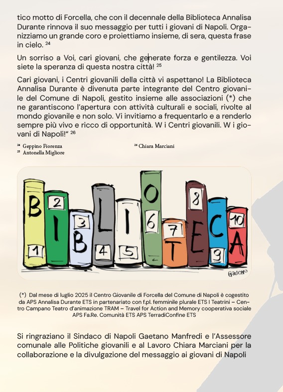 Aiutiamo i giovani ad abbracciare la cultura e la legalità. Ad bene agendum natum sumus (siamo nati per fare il bene) è l'antico motto di Forcella, che con il decennale della Biblioteca Annalisa Durante rinnova il suo messaggio per tutti i giovani di Napoli. Organizziamo un grande coro e proiettiamo insieme una cultura di abbracci e affetti. La Biblioteca Annalisa Durante diventa parte integrante del Centro giovani della città, gestito in sinergia con le associazioni che ne garantiscono l'apertura con attività culturali e sociali, rivolte al mondo giovane e non solo. Vi invitiamo a frequentare e a rendere sempre più vivo e ricco di opportunità. W i Centri giovani. W i Giovani di Napoli!